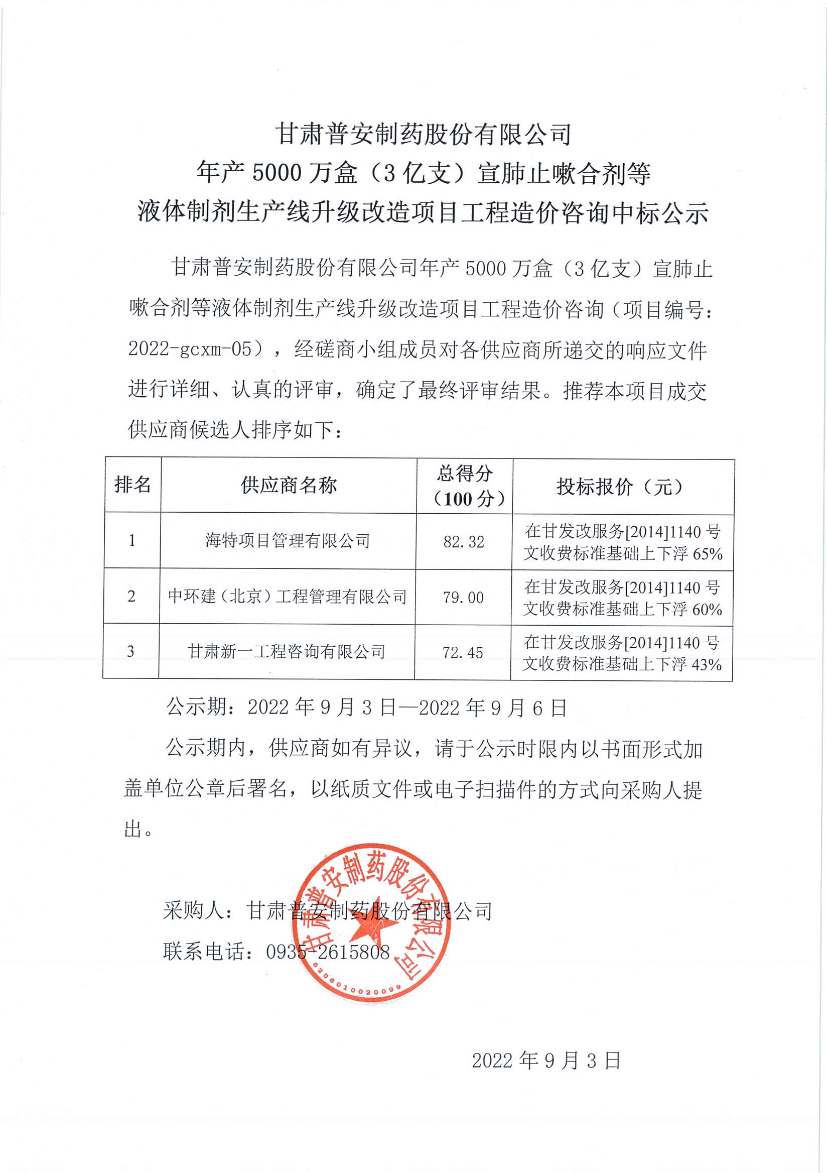 甘肅普安制藥股份有限公司年產(chǎn)5000萬盒(3億支)宣肺止嗽合劑等液體制劑生產(chǎn)線升級(jí)改造項(xiàng)目工程造價(jià)咨詢中標(biāo)公示