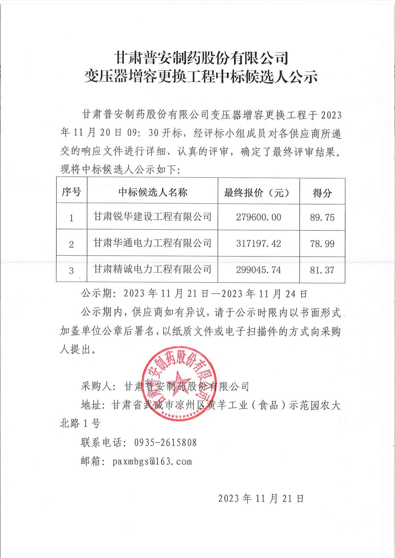甘肅普安制藥股份有限公司變壓器增容更換工程中標(biāo)候選人公示