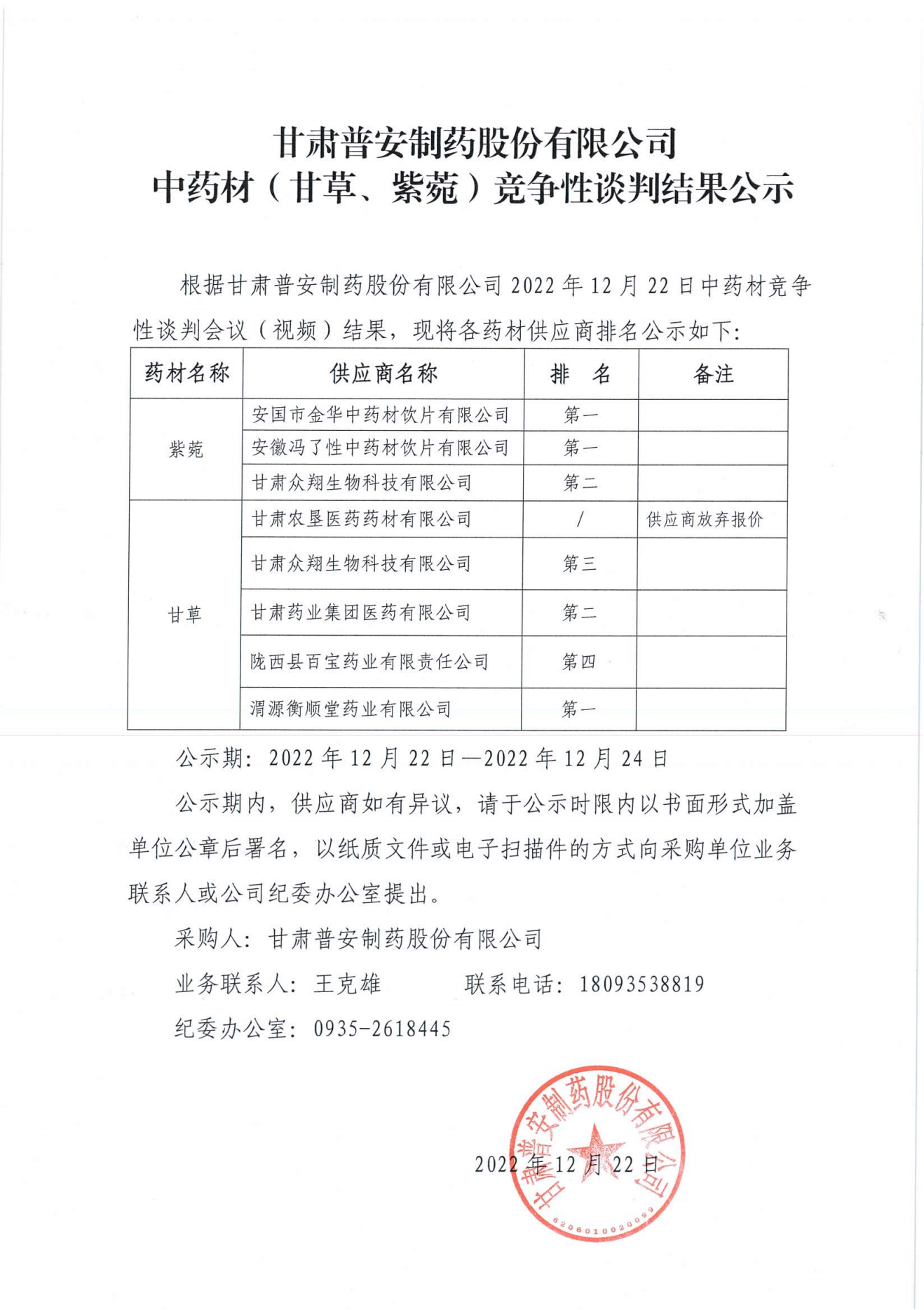 甘肅普安制藥股份有限公司 中藥材(甘草、紫菀)競爭性談判結(jié)果公示