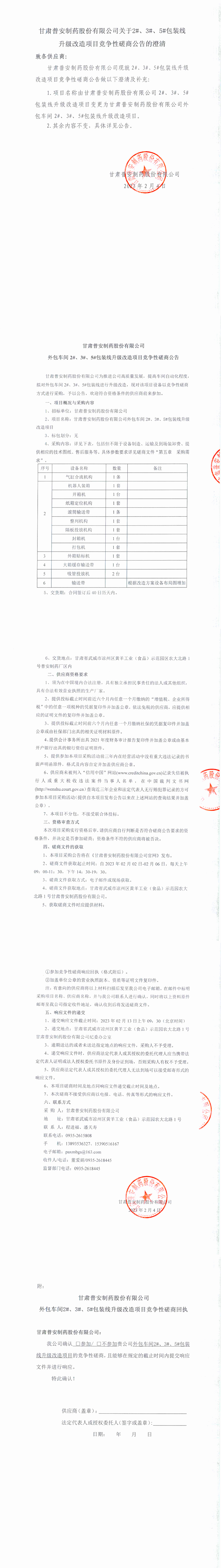 甘肅普安制藥股份有限公司關(guān)于2#、3#、5#包裝線升級(jí)改造項(xiàng)目競(jìng)爭(zhēng)性磋商公告的澄清