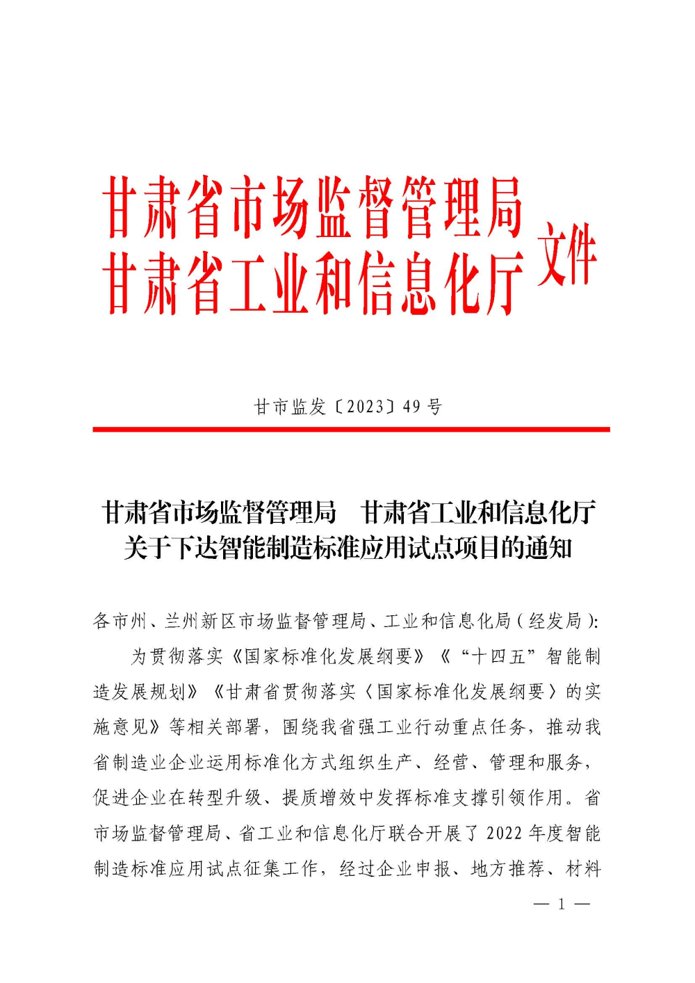 近日,甘肅省市場監(jiān)督管理局、甘肅省工業(yè)和信息化廳公布了省級智能制造標(biāo)準應(yīng)用試點項目名單。