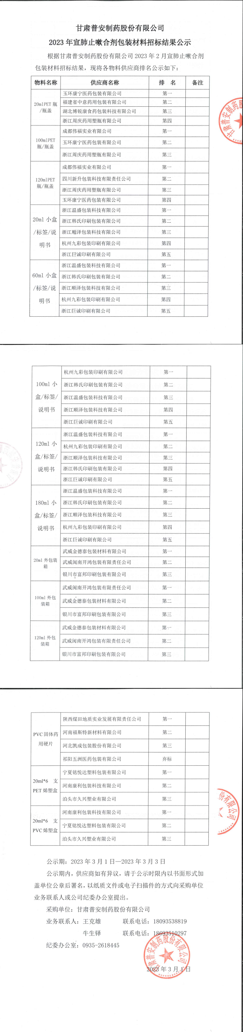 甘肅普安制藥股份有限公司2023年宣肺止嗽合劑包裝材料招標(biāo)結(jié)果公示