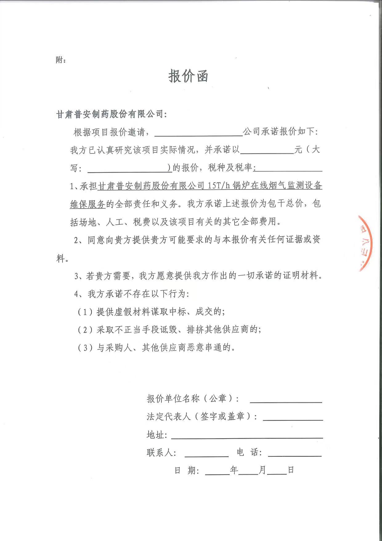 甘肅普安制藥股份有限公司15T/h鍋爐煙氣在線監(jiān)控設(shè)備運維報價邀請公告