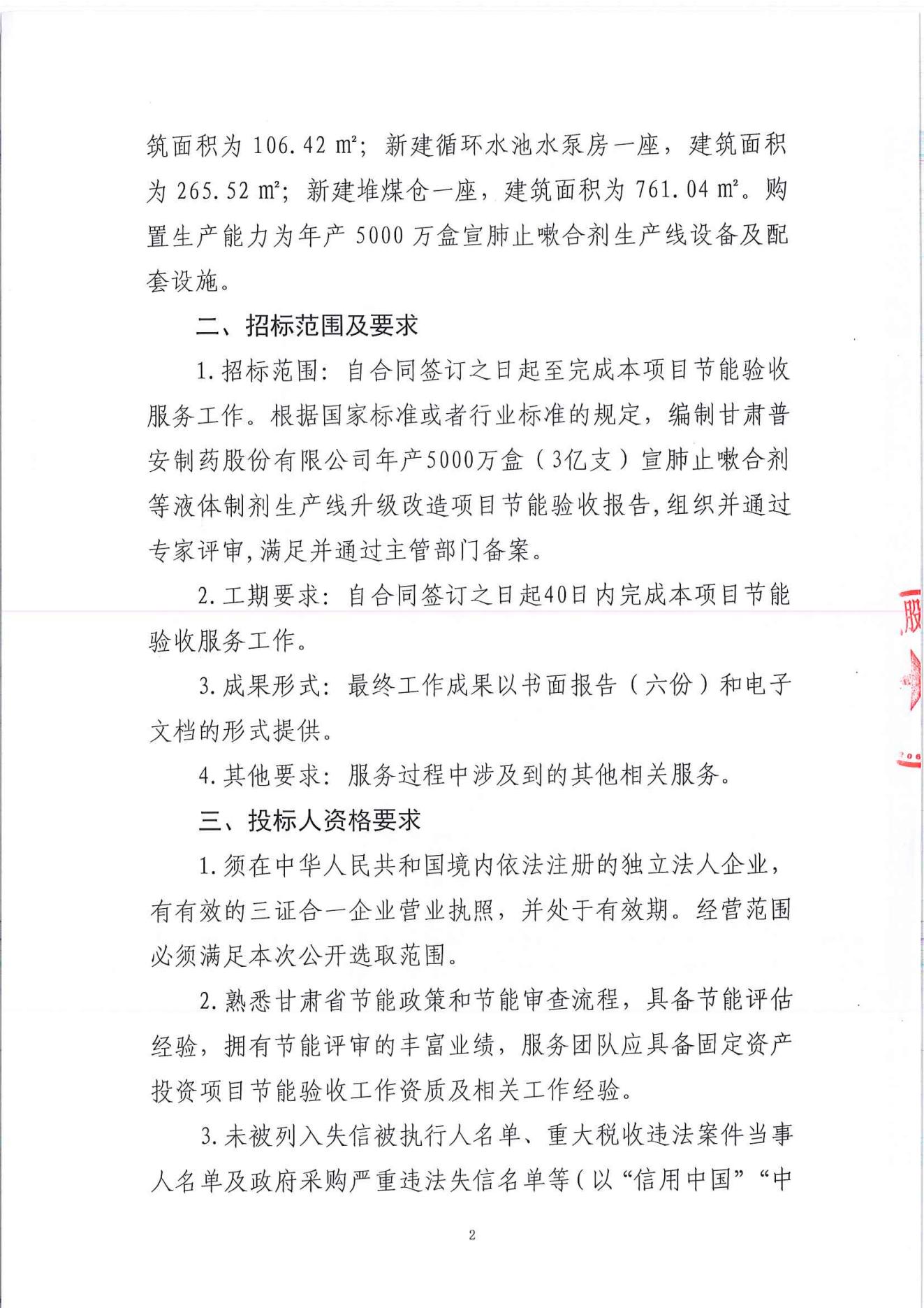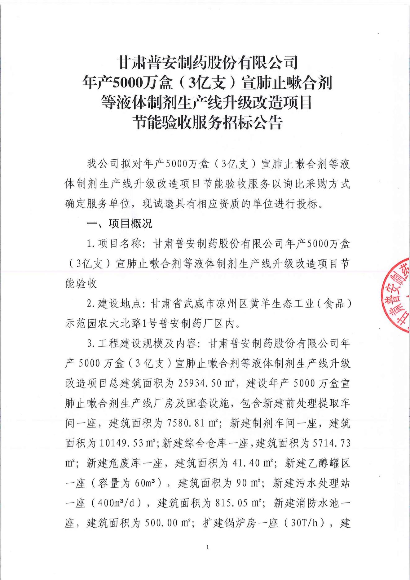 甘肅普安制藥股份有限公司年產(chǎn)5000萬盒(3億支)宣肺止嗽合劑等液體制劑生產(chǎn)線升級改造項目節(jié)能驗收服務(wù)招標(biāo)公告