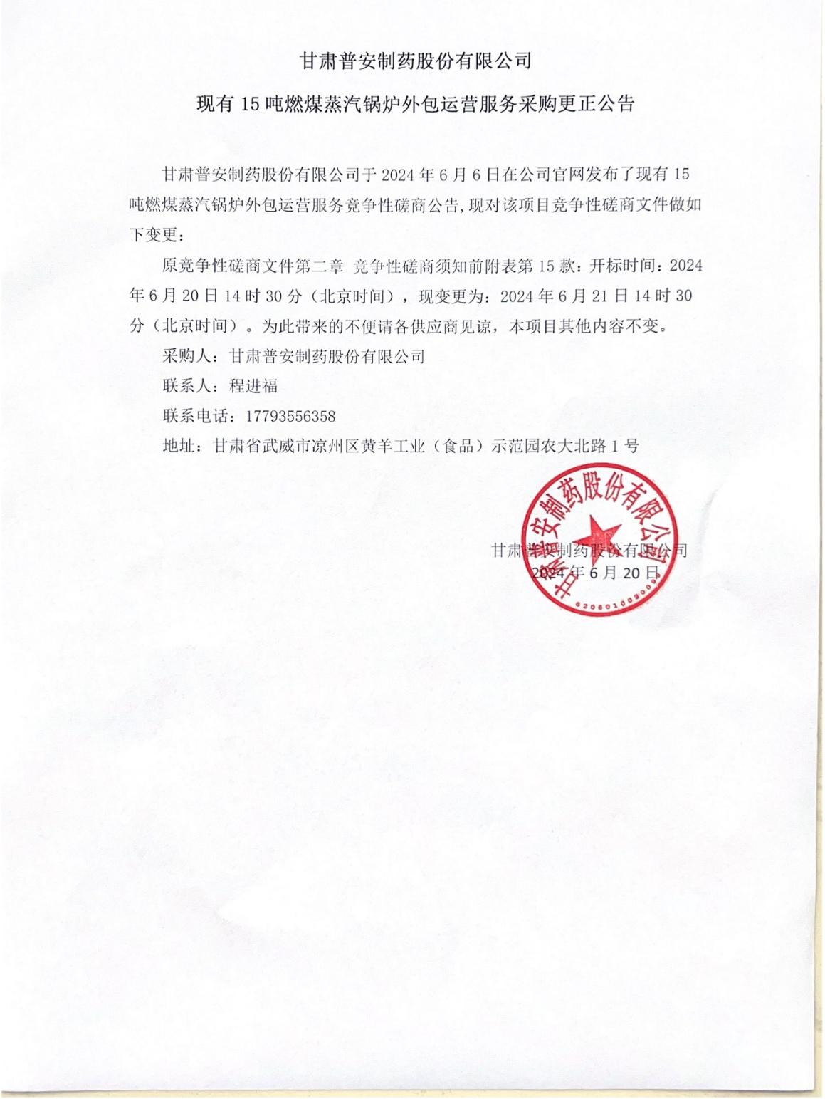 甘肅普安制藥股份有限公司現(xiàn)有15噸燃煤蒸汽鍋爐外包運(yùn)營(yíng)服務(wù)采購(gòu)更正公告