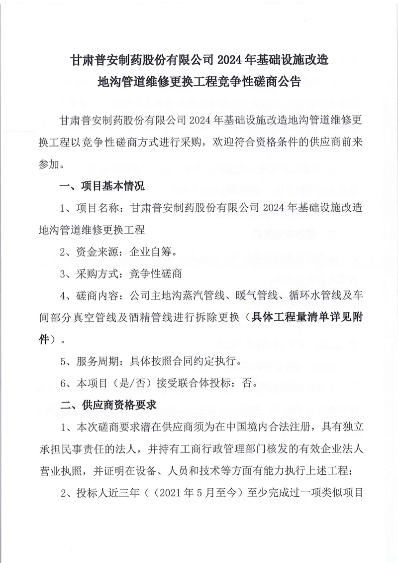 甘肅普安制藥股份有限公司2024年基礎(chǔ)設(shè)施改造地溝管道維修更換工程競爭性磋商公告