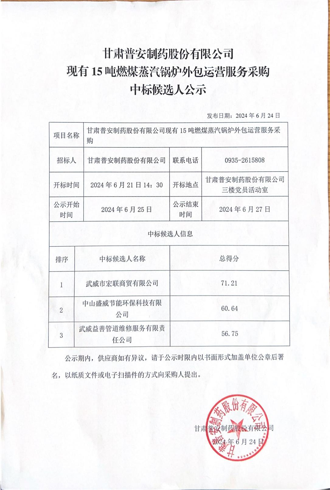 甘肅普安制藥股份有限公司現(xiàn)有15噸燃煤蒸汽鍋爐外包運營服務(wù)采購中標候選人公示