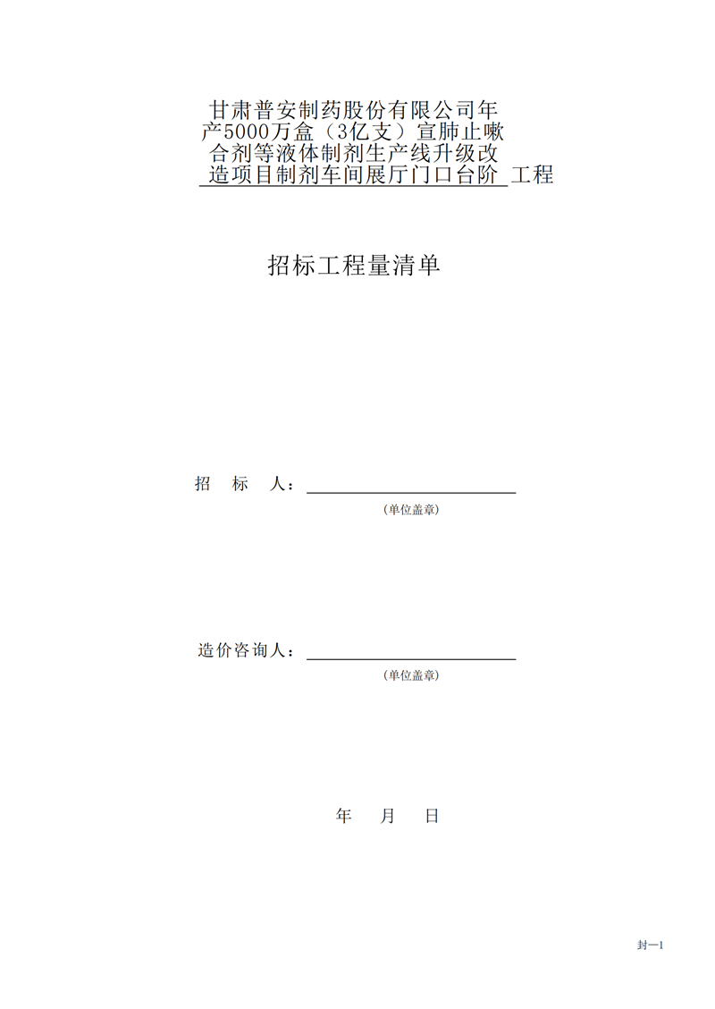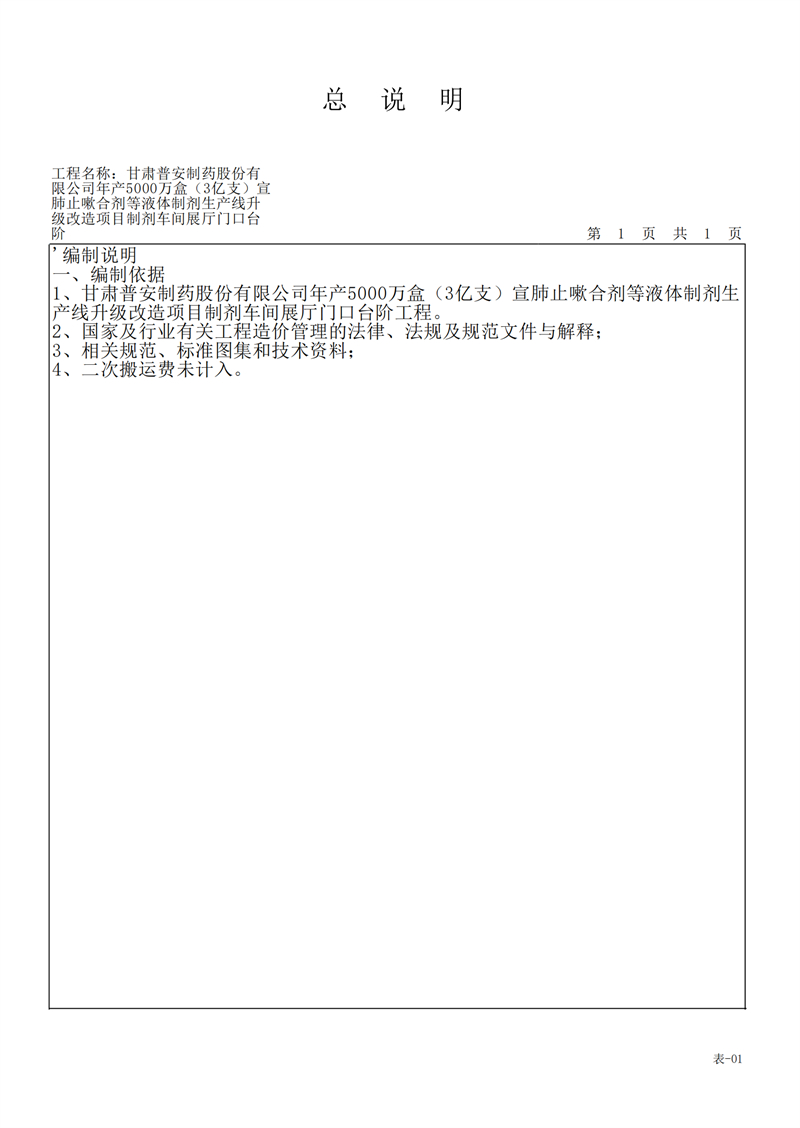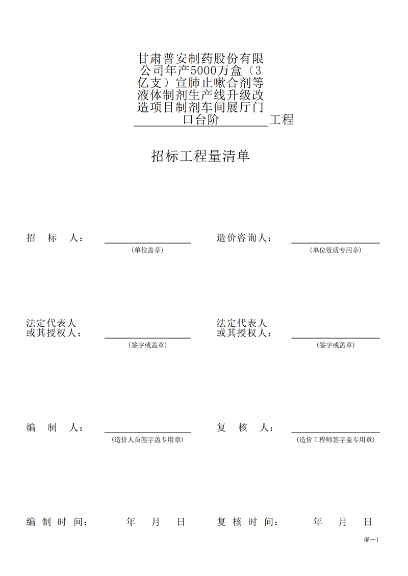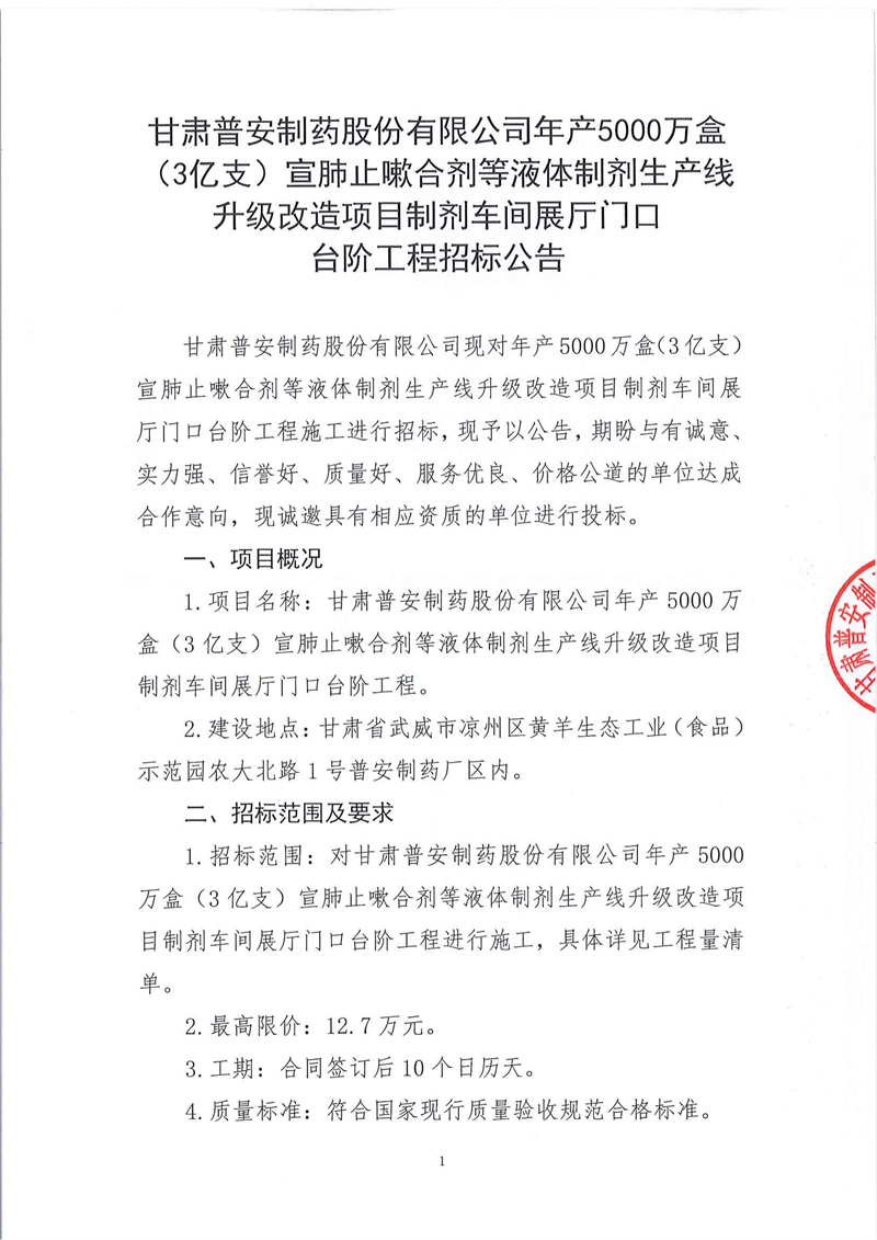 甘肅普安制藥股份有限公司年產(chǎn)5000萬盒(3億支)宣肺止嗽合劑等液體制劑生產(chǎn)線升級改造項目制劑車間展廳門口臺階工程招標公告