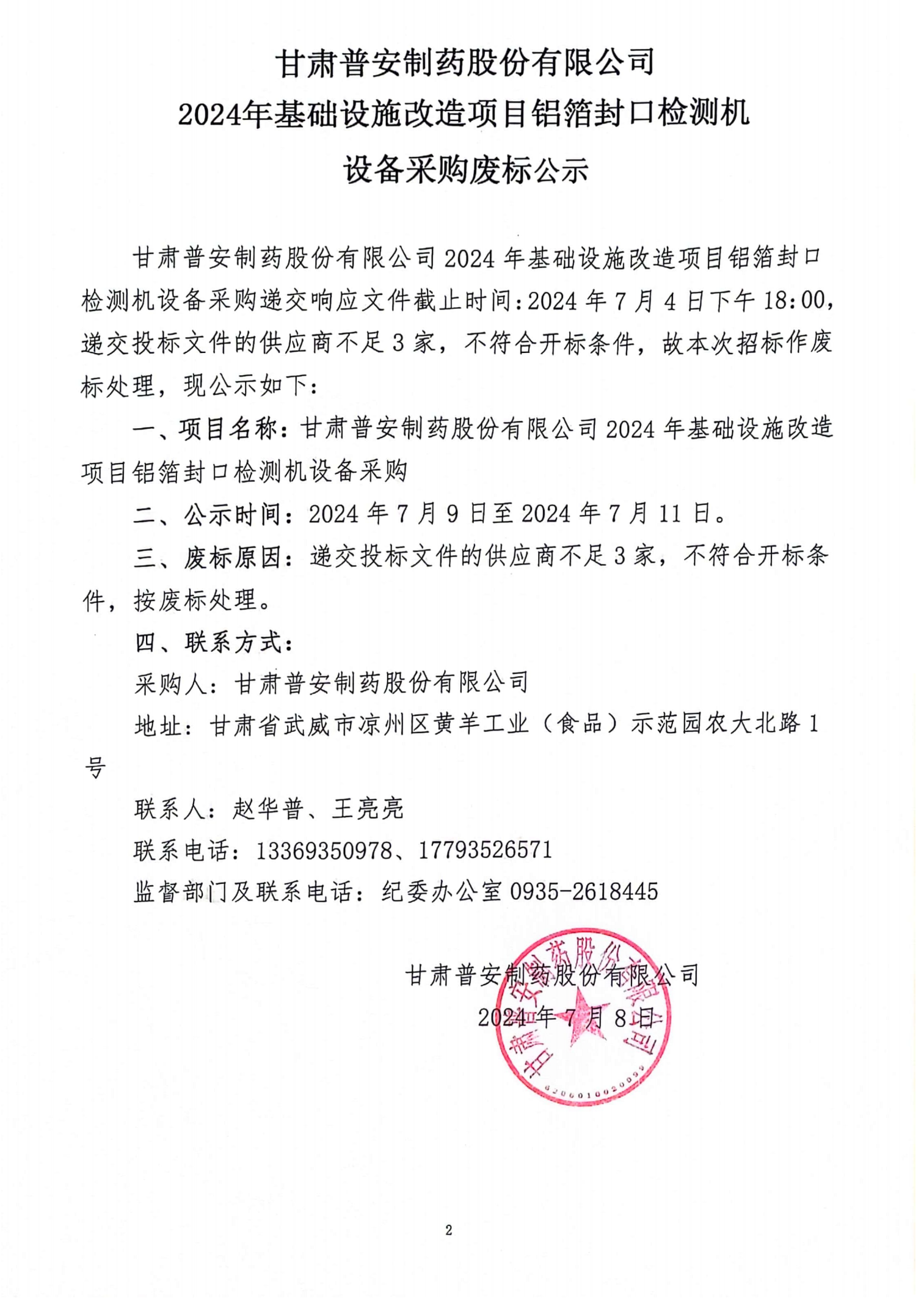甘肅普安制藥股份有限公司2024年基礎(chǔ)設(shè)施改造項目鋁箔封口機設(shè)備采購廢標公示