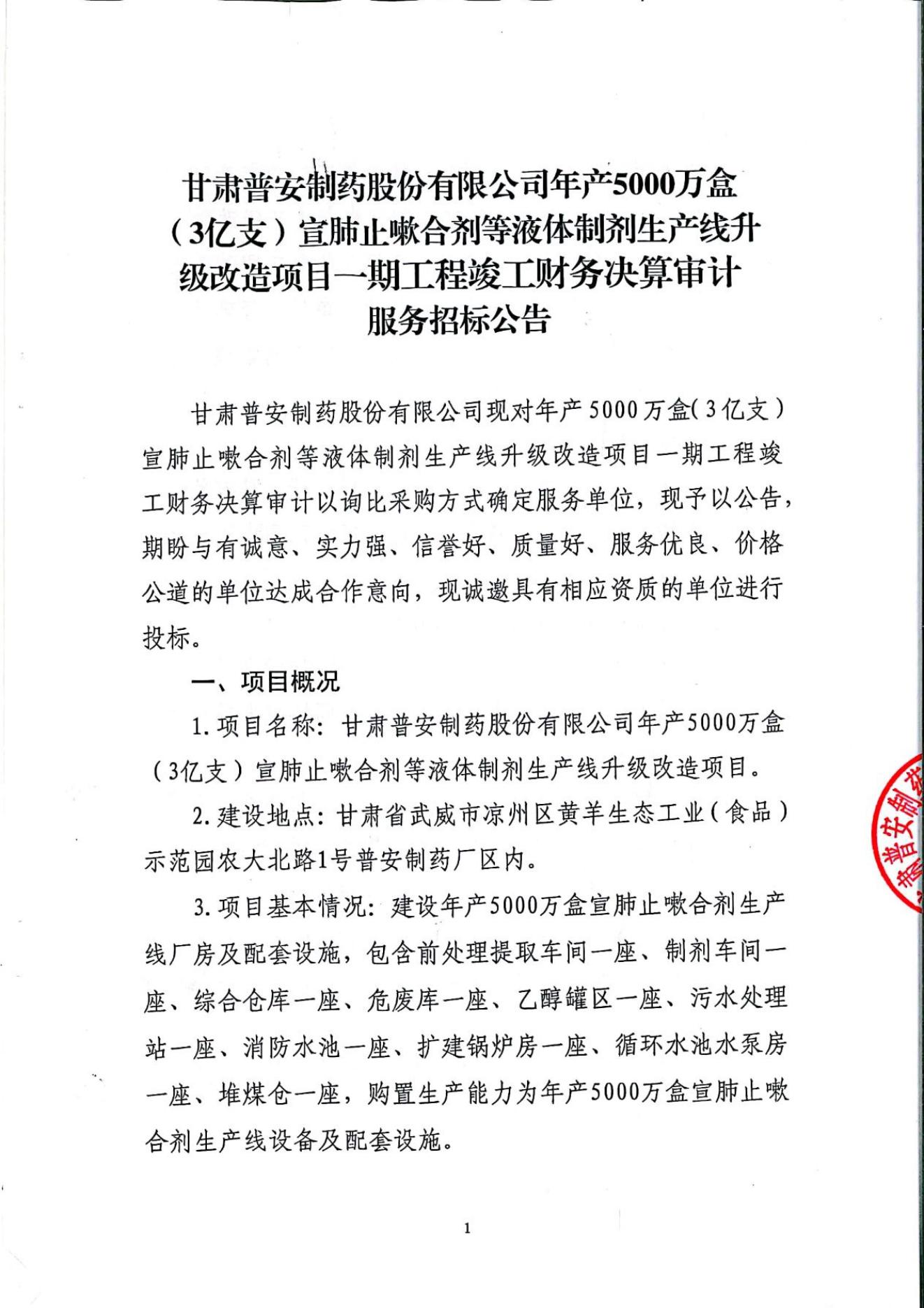 普安制藥年產(chǎn)5000萬(wàn)盒宣肺止嗽合劑等液體制劑生產(chǎn)線(xiàn)升級(jí)改造項(xiàng)目一期竣工決算審計(jì)服務(wù)招標(biāo)公告