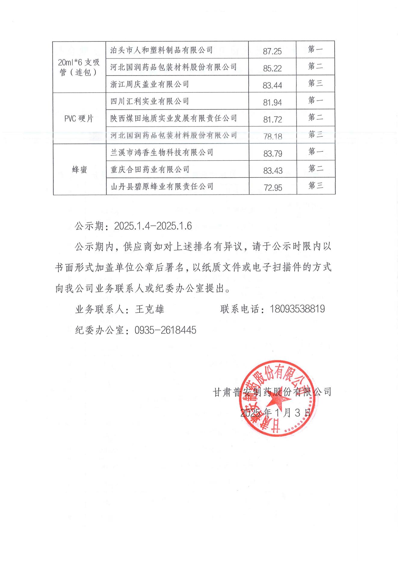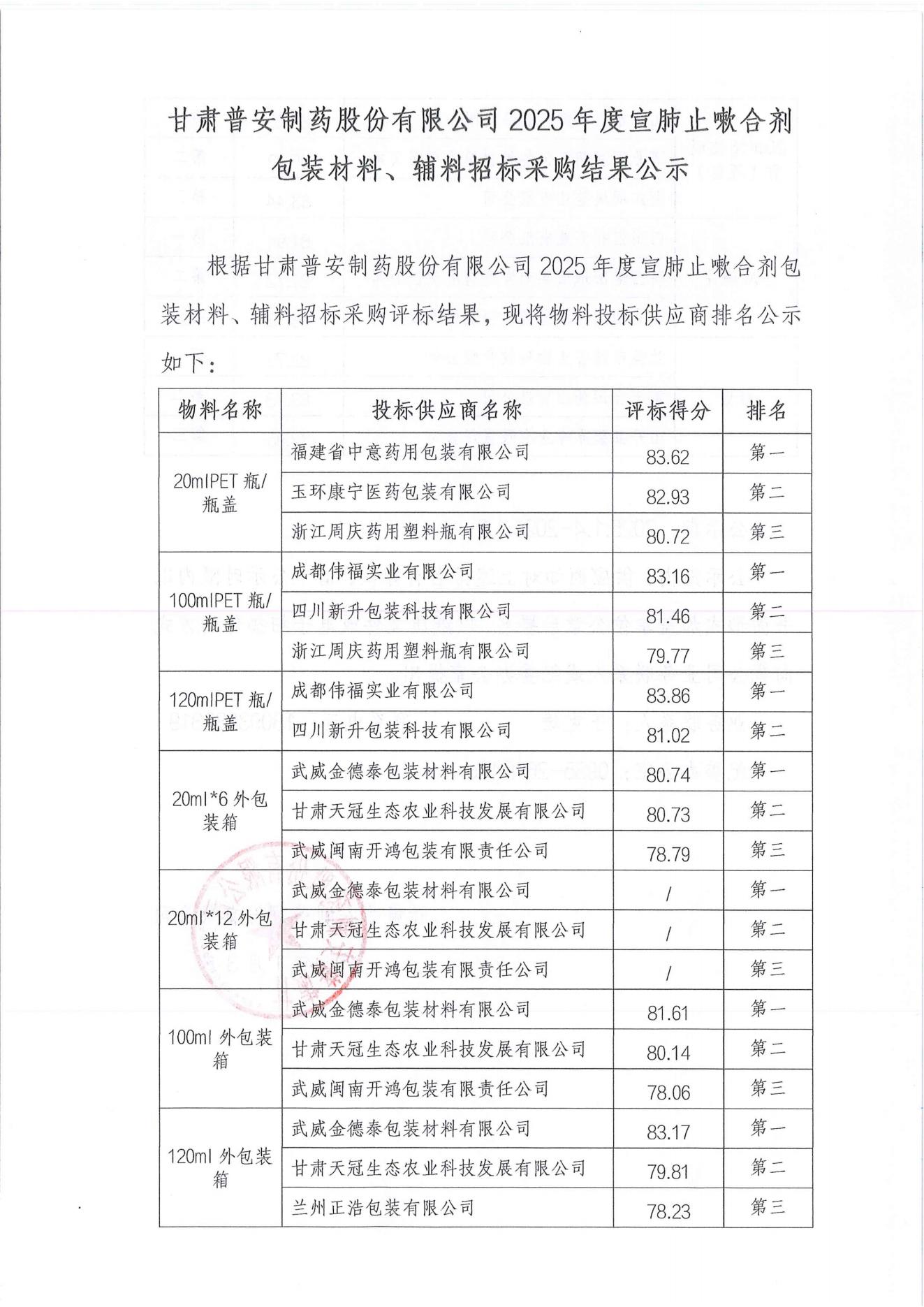 甘肅普安制藥股份有限公司2025年度宣肺止嗽合劑包裝材料、輔料招標(biāo)采購(gòu)結(jié)果公示