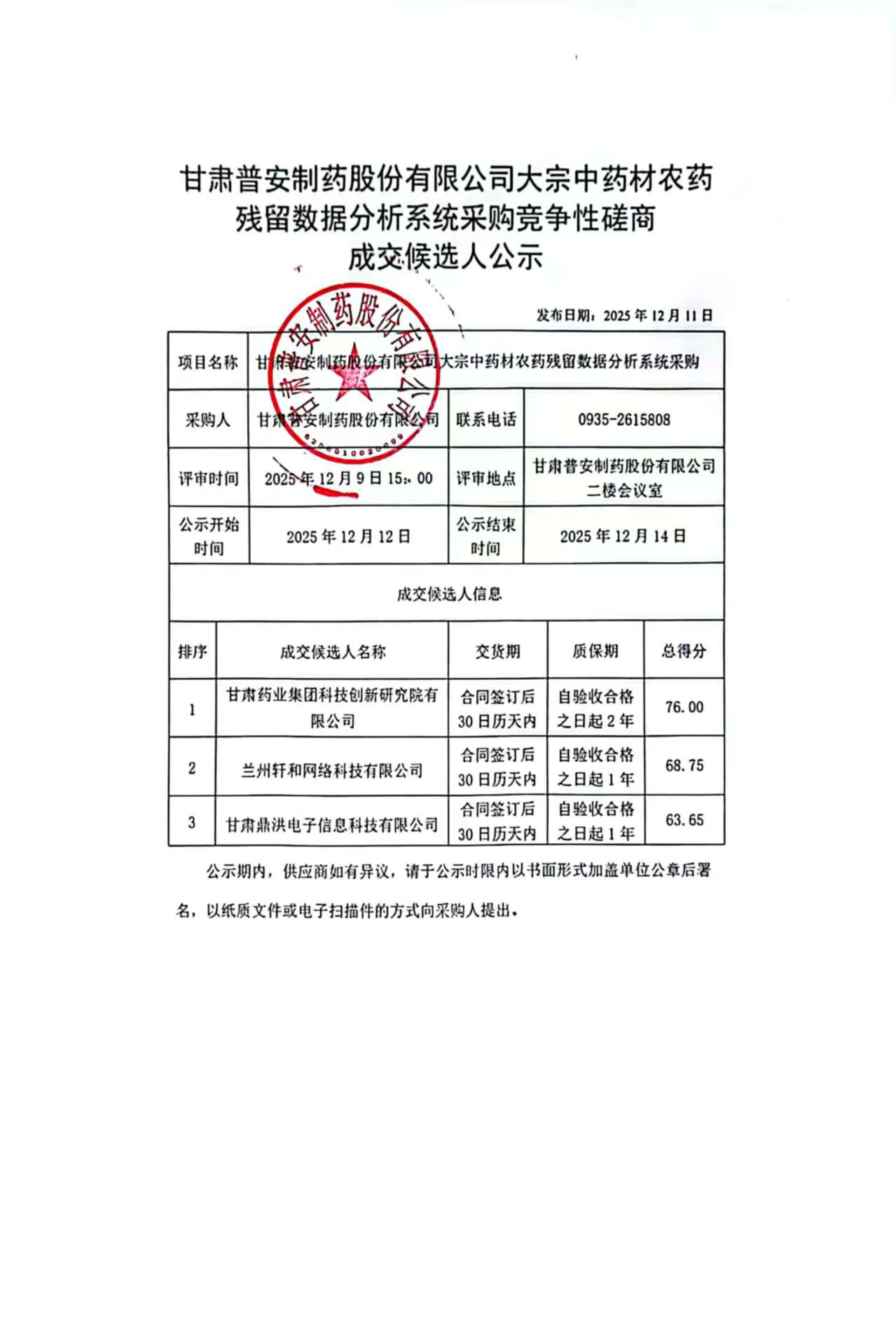 甘肅普安制藥股份有限公司大宗中藥材農(nóng)藥殘留數(shù)據(jù)分析系統(tǒng)采購競爭性磋商成交候選人公示