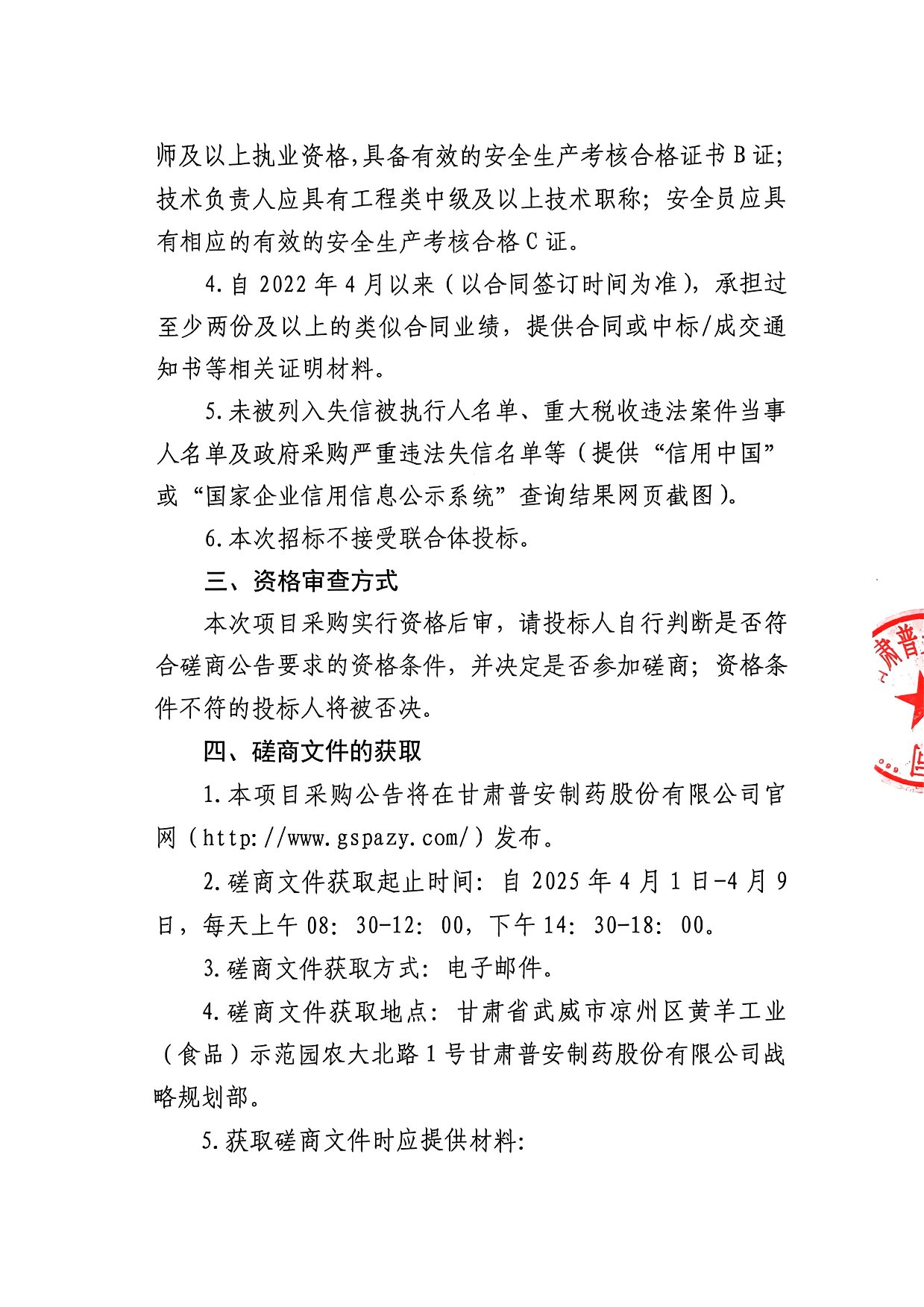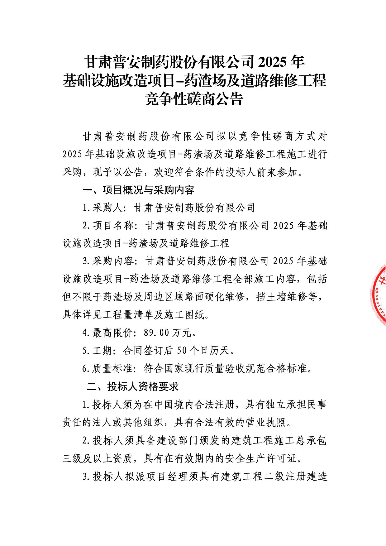 甘肅普安制藥股份有限公司2025年基礎(chǔ)設(shè)施改造項(xiàng)目-藥渣場(chǎng)及道路維修工程競(jìng)爭(zhēng)性磋商公告